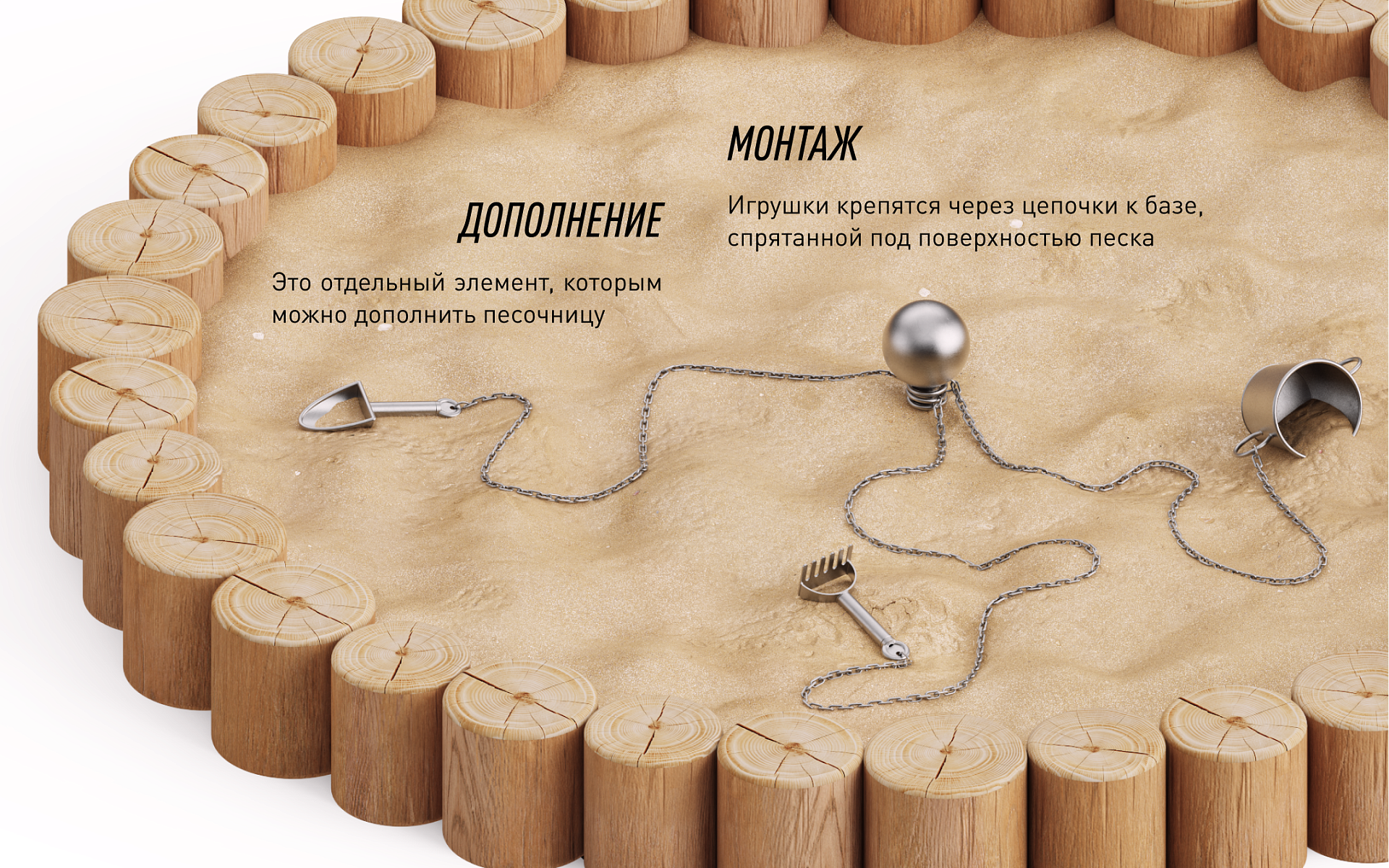 Аккуратные, прочные и продуманные формы, созданные специально для детских ручек, уже встроены в пространство, крепятся на цепочки, не теряются и не ломаются. Никакой суеты с формочками и никаких забытых лопаток.