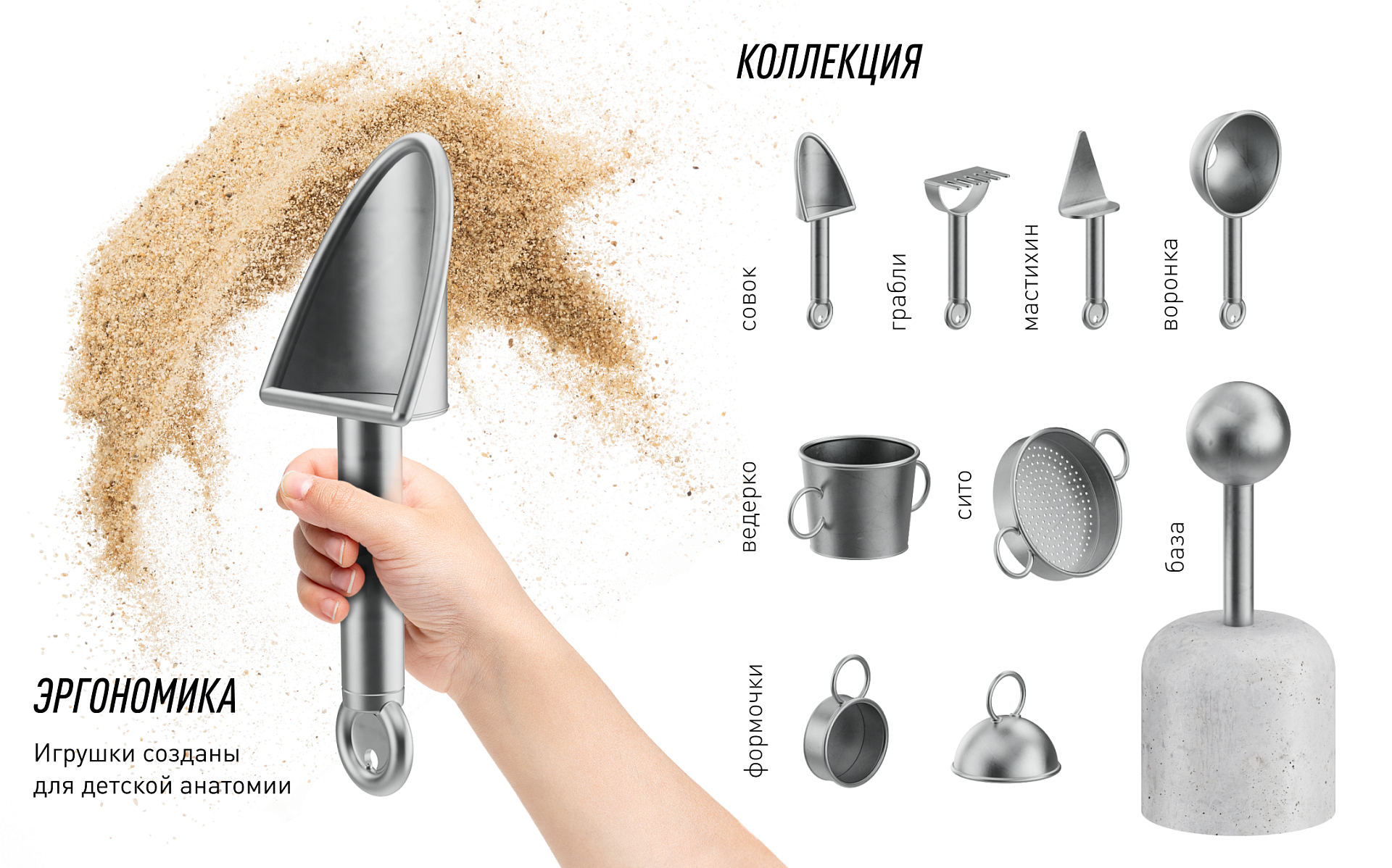 Мы решили, что игрушки должны стать частью среды, и разработали серию песочных аксессуаров, которые приятно держать в руках и классно находить в песочницах.