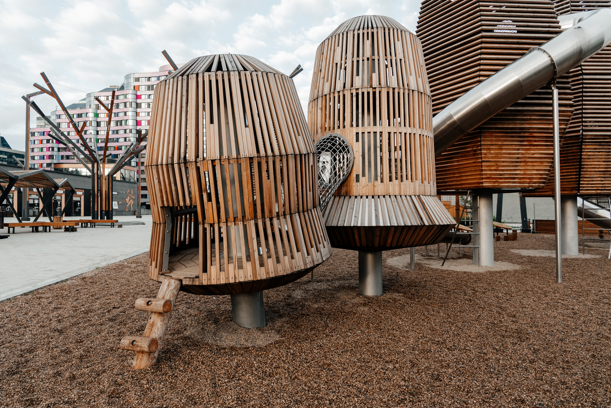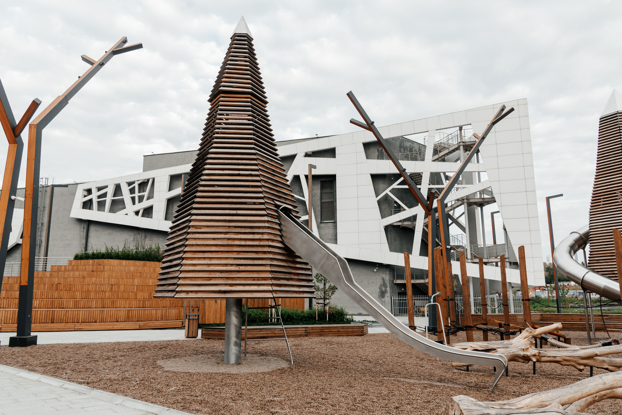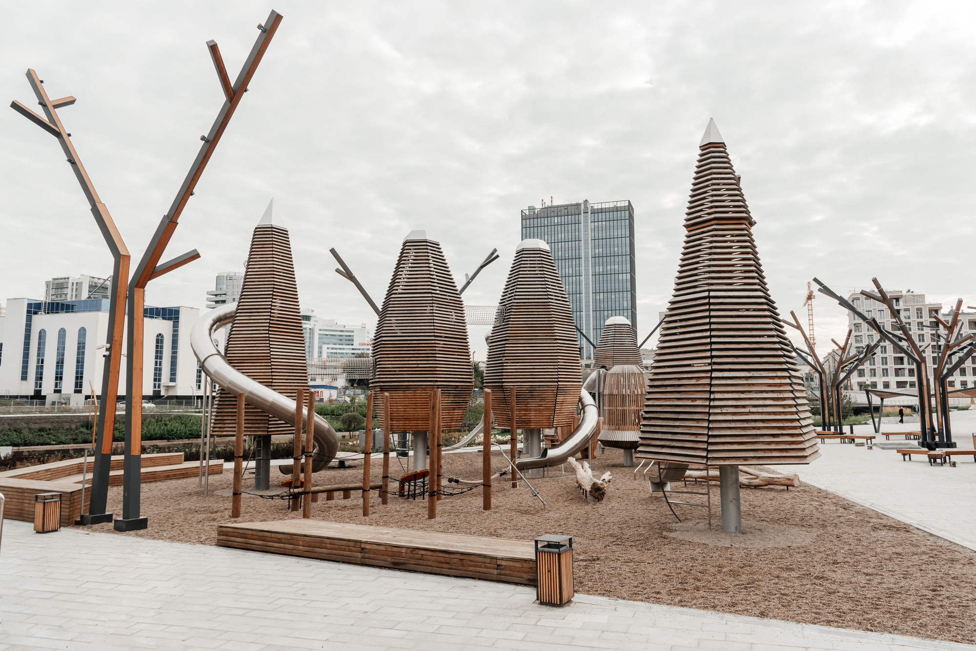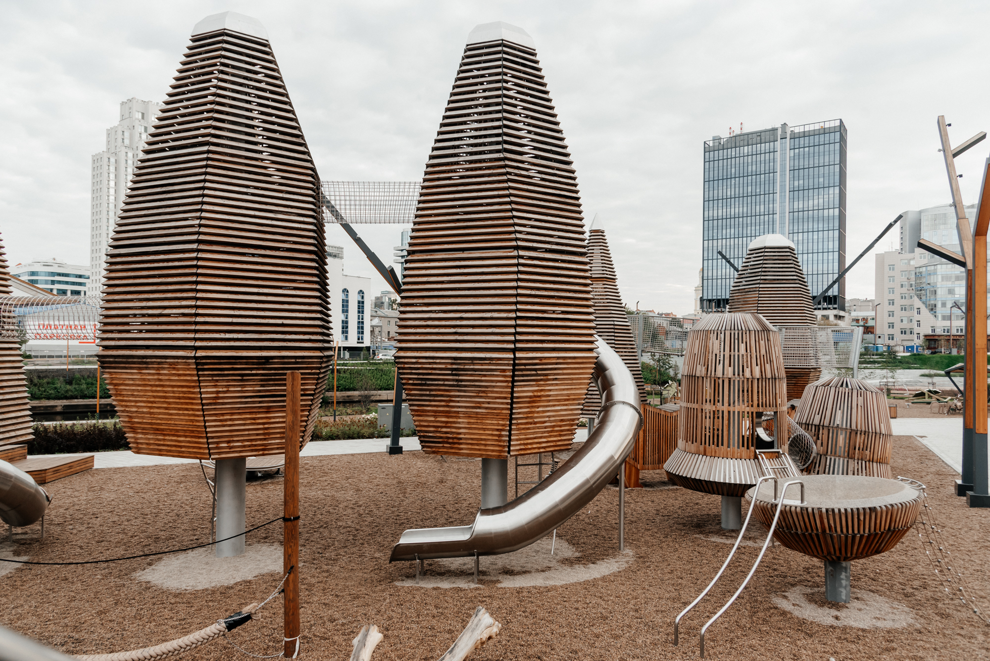 Мы вошли в проект благоустройства набережной реки Исеть в качестве экспертов по игровой среде по приглашению ландшафтного бюро S&P. За основу площадки была взята предложенная архитекторами идея «Уральского леса». Дальнейшая работа нашей команды превратила идею в полноценный проект с уникальной инженерией и продуманными сценариями игры. Появилось зонирование и взаимодействие между объектами, площадка стала живой, логичной и безопасной. Центральные фигуры пространства - башни в форме хвойного и лиственного дерева, символизируют смешанный уральский лес. Нам не хотелось создавать деревья одинаковыми фигурами. В итоге, с помощью использования неправильных шестиугольных сечений, удалось сохранить природную индивидуальность каждого дерева. Игровые деревья никогда не повторяются в своих очертаниях, собственно как и живые деревья в реальной жизни. Работа над конструкторской документацией, а также физическое создание и контрольные сборки деревьев на производстве стали настоящим инженерным испытанием, но именно так рождается подлинная индивидуальность.