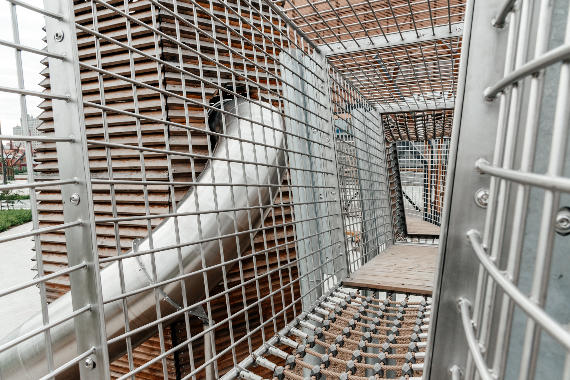 Внутри башен получились целые лабиринты пространств со смотровыми башнями, высокими прозрачными переходами и длинными тоннельными горками.